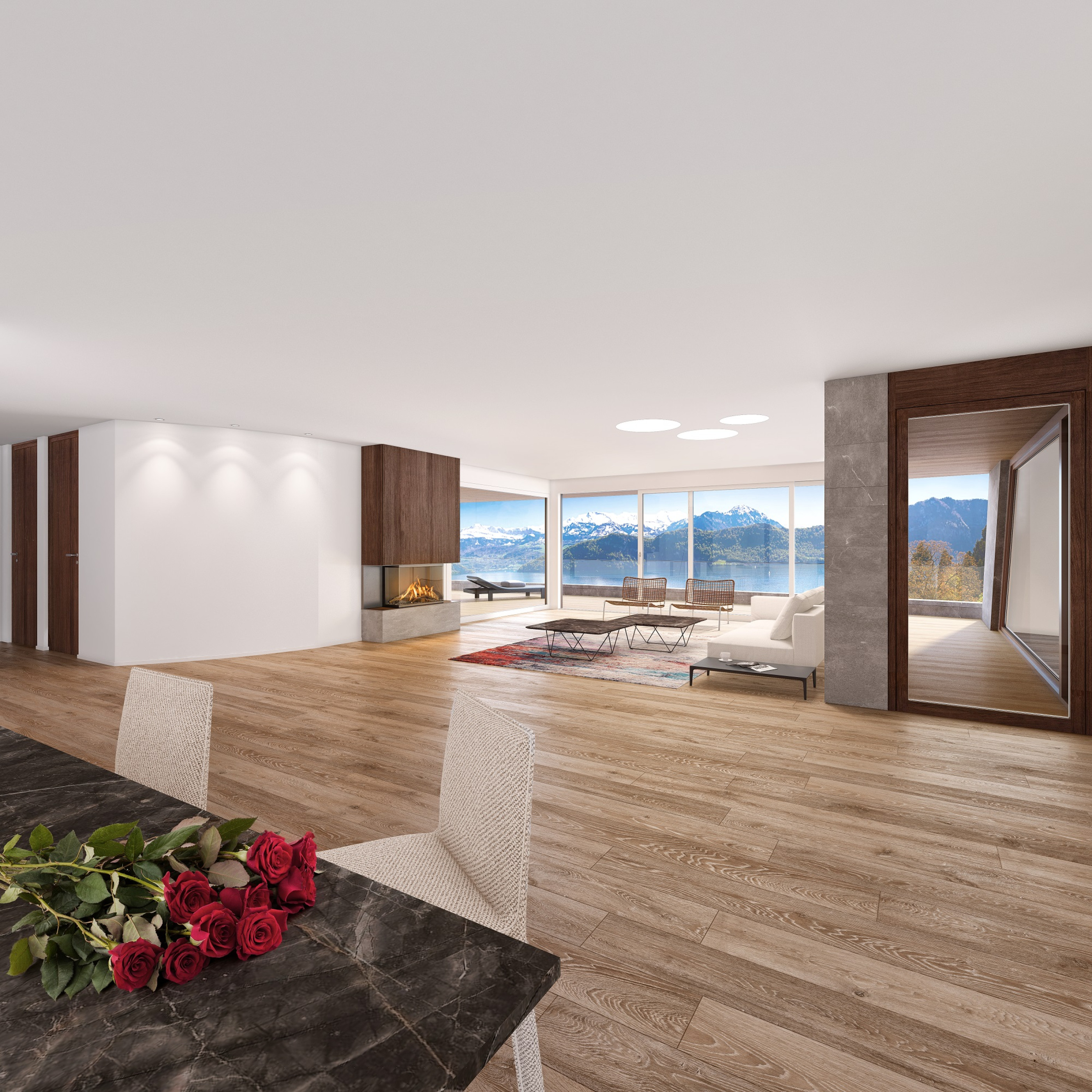 Etwas oberhalb vom Dorf gelegen mit freier Sicht auf See und Berge. Die Weite und Helligkeit der Wohnungen in Holz und Stein geben einem das maximale Wohlgefühl. Die grossen Terrassen laden zum Verweilen ein.